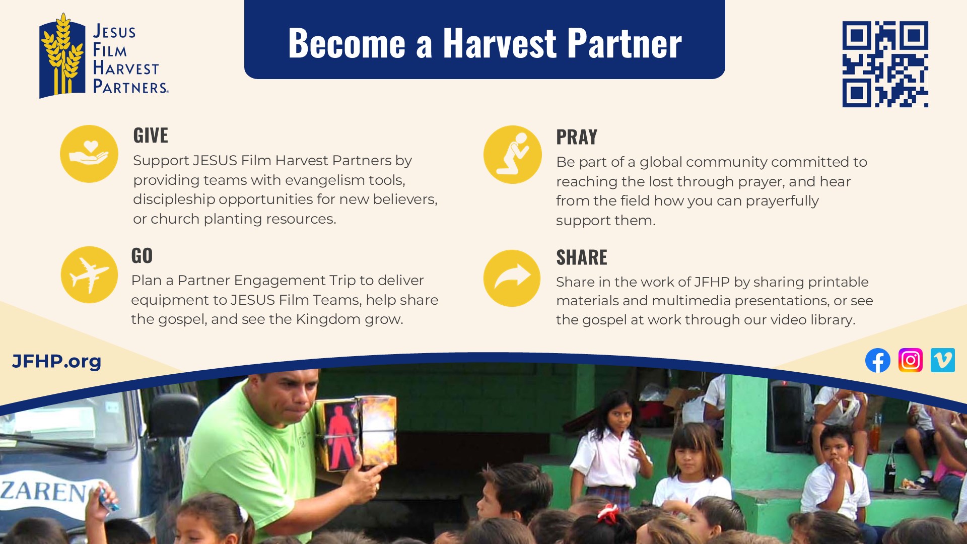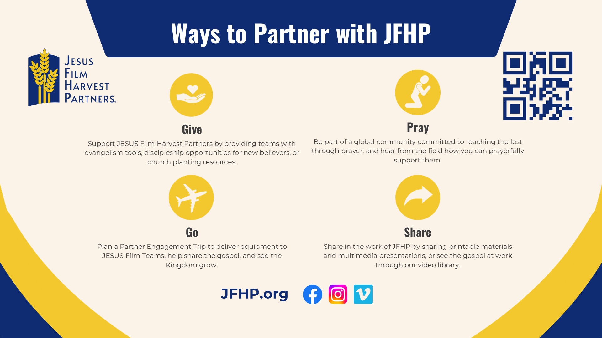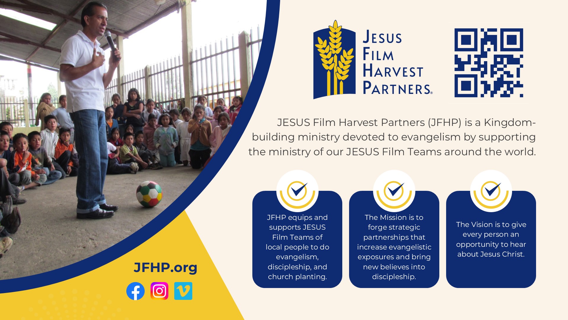 JESUS Film Harvest Partners (JFHP) is a Kingdom-building ministry devoted to world evangelism through the JESUS film and other tools. JFHP equips and supports JESUS Film Teams of local people to do evangelism, discipleship, and church planting.